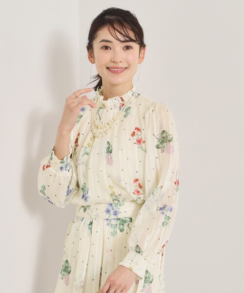【デザイン】ロングセラーのラメストライプシリーズ。26春の新柄は、花×ドットの大人可愛いデザインです。春を感じる軽やかなシアー素材に、繊細なラメのラインが品よく華やぎます。顔回りを華やかに演出してくれるシャーリングのスタンド襟。袖口もシャーリングデザインで手元をエレガントに演出。裏地はジャージー素材なので肌辺り柔らかで軽い着心地です。同素材のスカート【P93-65502】とセットアップでの着用が可能です。【素材】透け感のあるシアーストライプ生地に細いラメのラインを入れた繊細な素材。身頃はジャージー素材の裏地付き。※照明の関係により、実際よりも色味が違って見える場合があります。また、パソコン・スマートフォンなどの環境により、若干製品と画像のカラーが異なる場合もございます。----------------------------------------★お気に入り登録がおすすめ★▽気になる商品はハートマークをクリック!・再入荷やセールの通知をお知らせ・お気に入り一覧からいつでもチェック▽ブランドのお気に入り登録も!・新商品やお得な情報をいち早くお知らせ----------------------------------------モデル情報:身長164cm B80 W60 H84 着用サイズ:00(フリーサイズ)店舗へのお問い合わせ商品番号:P93-55509●製品寸法:00(フリーサイズ):着丈56cm B94cm 袖丈56cm 肩幅29cm備考: