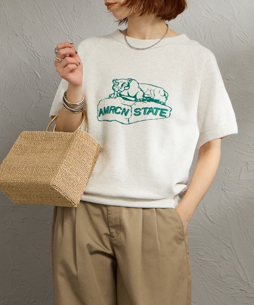 ヴィンテージ感漂うカレッジプリントが可愛い半袖スウェット< デザイン・シルエット >●古着スウェットを彷彿とさせるアニマル柄のプリントが目を惹くショートスリーブスウェット●大人カジュアルスタイルにマッチするニュアンスたっぷりのアイテム●コンパクトなシルエットとラグランスリーブのデザインが今の気分にマッチする一枚●袖口と裾にリブをあしらい、野暮ったく見えないすっきりとしたメリハリのあるシルエットになっています●フロッキープリントがヴィンテージ感溢れ、大人カジュアルスタイルにマッチ●着丈を短めに仕立てることで、ルーズになり過ぎずすっきりとした絶妙なバランスに●着心地と動きやすさをアシストする、両脇に取り付けられたリブもさりげないポイント●シンプルにさらっと一枚で着たり、カットソーやブラウスとのレイヤードも楽しめるマルチなアイテム●デニムやチノパン合わせでハンサムに着こなしたり、きれいめスカートとの組み合わせもおすすめ< 素材 >●ふんわりと柔らかい肌触りが魅力的な裏毛素材を使用●分厚過ぎないライトな生地感はアウターのインナーにもぴったりで、ロングシーズン着回せる便利さが魅力的●肌馴染みが良く、着込むほどに柔らかくなっていきます●マシーンウォッシャブルなアイテムなので、自宅で簡単にお手入れができるところも嬉しいポイント----------------------------------------------------------------------透け感:なし生地の厚さ:普通伸縮性:あり裏地:パイル洗濯方法:洗濯機可----------------------------------------------------------------------メーカー品番:BRF-800A-2【Americana/アメリカーナ】古着をデザインソースに、それ自体の持つ良さを追求し、日常生活をベースに再解釈した服。布地にこだわりを持ち、すべての商品において国内生産で自社製造している。古着をモチーフにしたプリントやデザインに加え、古着ではあらわせない形の良さを表現している。★お買い物をよりお楽しみ頂く為にお気に入り登録がおススメです! ▼商品のお気に入り登録商品ページ内のハートマーク♡をクリック。完売時の再入荷や、最後の1点の通知、お得なお値下げの通知を受ける事ができます。 【お知らせ】ページでも通知が確認できます。 ▼ブランドのお気に入り登録新商品や再入荷など、いち早くブランドのお得な情報を受け取ることができます。
