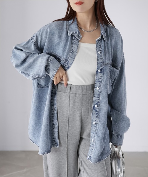 【Riberry 接触冷感2WAYテンセルデニムシャツ】\接触冷感でひんやり快適/その日の気分でシルエットチェンジできる2WAYデニムシャツ♪■Stylingとろみのある落ち感と、ひんやりとした肌触りが魅力のテンセルデニムシャツが登場しました。デニム見えしながらも、テンセル特有のなめらかで柔らかな素材感で、ごわつきのない軽やかな着心地を叶えた一枚です。肌に触れた瞬間にひんやり感じる接触冷感素材なので、春夏はもちろん、ロングシーズン快適に着用できるのも嬉しいポイント。最大の特徴は、着こなしをアレンジできる2WAY仕様!前身頃だけをくるっと内側に折り込んだようなトレンド感のある着方が可能で、後ろ裾にはスナップボタンを配置し、しっかり固定できるデザインに。スナップは二段階調整ができるため、インする分量やシルエットのバランスをお好みで調整していただけます♪前側イン仕様で、ワイドパンツやスラックスと合わせれば抜け感のある大人カジュアルスタイルに。タイトスカートやナロースカートと合わせると、デニムシャツでも女性らしいバランスに仕上がります!ボタンを開けて、ロゴTやタンクトップの上に羽織れば、季節の変わり目にも使える軽アウター感覚の着こなしもおすすめ。機能性とデザイン性を兼ね備えその日の気分で着方を変えられる、Riberryらしいこなれ感たっぷりのデニムシャツです。●COOL TOUCH『接触冷感』肌に触れた瞬間に、ひんやりとした感覚を得られ、爽やかに涼しく着用いただけます。■Detail身幅にゆとりのあるシルエットで、体のラインを拾いにくくヒップラインをさりげなくカバーしてくれます!フロントには実用性のある大きめの胸ポケットを左右に配置し、デザインのアクセントにも。シンプルなシャツとして、前側をロールアップさせて2WAYで着用できるデザイン。自然にウエスト位置が高く見え、さりげなくスタイルアップ効果もあります◎■Materialテンセル特有のなめらかな肌触りと美しいドレープ性が魅力で、デニム見えしながらも軽やかな着心地を実現しています。さらに接触冷感機能付きなので、肌に触れた瞬間ひんやりと感じられ、春夏シーズンも快適に着用可能。暑い時期の羽織としても活躍します◎▽生地感透け感:あり 〇〇〇●〇 なし生地の厚さ:厚い 〇〇〇●〇 薄い裏地:なし伸縮性:なし※この素材は性質上、発汗、摩擦等により、ほかの衣料やバッグなどに多少色落ちや色移りする場合がありますので、十分にご注意下さい。※お肌のデリケートな方は刺激を感じる場合がございます。※商品の梱包には細心の注意を払っていますが、通販の特性上、到着時に畳みシワがついている可能性がございます。ご理解ください。※詳しいお手入れ方法は商品タグをご参照ください。【Information】◆《お気に入り登録》がオススメ◆・「商品のお気に入り登録」で再入荷通知や、ラストの通知、セール通知も受け取ることが出来ます。・「ブランドのお気に入り登録」で新商品や再入荷など、お得な情報を受け取ることが出来ます※撮影時のライティング、ご覧になっているモニター・PC環境により、実際の商品と色味が異なって見える場合がございます。予めご了承をお願い致します。