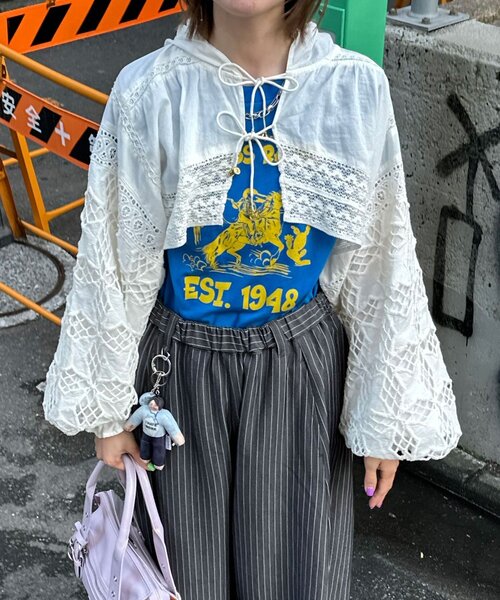 重ねるだけで雰囲気が出るレースボレロ ※この製品はインドで生産されたものです。多少のデザインのずれは商品の特徴のひとつですので予めご了承ください。 ※生産の都合上、お届け時期が前後する場合がございます。 ▼ポイント ナチュラルな風合いのインド綿を使用した、フード付きレースボレロ。 鍵あみレースの透け感に、前リボン結びのデザインがさりげない甘さをプラス。 紐の先にはコインチャームをあしらい、動くたびに古着ライクなアクセントを効かせました。 軽く羽織れるサイズ感で、季節の変わり目にも取り入れやすい一枚です。 ▼スタイリング キャミやタンク、シアートップスの上から重ねるだけで、抜け感のあるレイヤードスタイルに。 デニムやワークパンツと合わせれば、甘さを抑えた大人カジュアルに仕上がります。 【インド綿とは】 インドで栽培されているコットン生地のことを言います。 ナチュラルで、素朴な素材感が魅力的。 さらり..ふわり…と軽く、柔らかさのある風合い。またシワ、色ムラ、織りムラなどオリエンタルな独特の風合いを持っているのも特徴です。 通気性・吸水性に優れているので、湿度が高く蒸し暑い日本の春夏にぴったりな素材です。 --------------------------------------------------- 透け感:あり 伸縮性:あり(袖口) 裏地:なし 光沢:なし --------------------------------------------------- 家庭洗濯:40℃限度/ 手洗い可 タンブル乾燥:不可 アイロン:低温110℃まで クリーニング:ドライクリーニング不可, 非常に弱い処理によるウェットクリーニング可 --------------------------------------------------- 【She desires…】 「女の子が誰しも憧れるクローゼット」をテーマに、2025SSからスタートしたCIAOPANIC発の新ブランド。 優しく柔らかなオフホワイトやベージュを基調に、インド製の特別なアイテムをお届けします。 伝統的な風合いを大切にしながら、程よくトレンドを取り入れたデザインが魅力的。 細部にまでこだわり抜かれたアイテムは、毎日のコーディネートをより華やかに、そして特別なものにしてくれます。 --------------------------------------------------- ※着用、お取り扱いの際は、商品についている品質表示とアテンションタグを必ずご確認下さい。 ※画像の商品はサンプルです。実際の商品と仕様、加工、サイズが若干異なる場合がございます。 ※可能な限り実物に近いカラーにて掲載していますが、撮影環境やモニター環境などにより製品と画像のカラーがやや異なって見える場合もございます。予めご了承ください。 【お買いものをよりお楽しみいただく為に!!】 ▼商品のお気に入り登録(ハートマークをクリック) お気に入りアイテムの完売カラーの再入荷通知や、ラスト1点の通知、セールの通知も受け取ることができます。 ▼ブランドのお気に入り登録 新商品や再入荷、クーポン配布などのお得な情報を受け取ることができます。