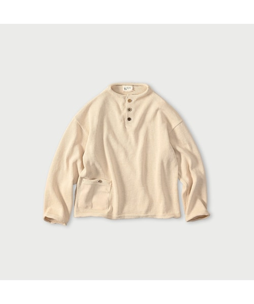 天然由来のニットソーこんにゃく芋をすり潰した粉末を水に溶かして糊をつくり、コットンの糸にコーティング。糊の作り置きはせず、作る分だけ少しずつ。100%天然由来の製法でつくるギマの糸は、人にも地球にもやさしい素材です。ゆったりとした身幅の馬比古シルエットに前あきとポケットを付けました。ボタンを開けてインナーを見せる着こなしもおすすめのプルオーバーニットです。