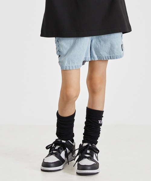 サイドのレースアップ風デザインが存在感を放つデニムショートパンツです。切り替えと裾部分の丈に差を出しているのがポイント。ウエストはアジャスターつきのゴム仕様になっており、簡単にお着替えできます。ビッグシルエットのトップスと合わせてラフに着こなすのがおすすめです。内側にお名前を記入できるタグつき。【おすすめの着用時期は春夏シーズン】【透け感】透けない【生地の厚さ】普通【伸縮性】あり【裏地】なし【ポケット】あり【アジャスター】あり