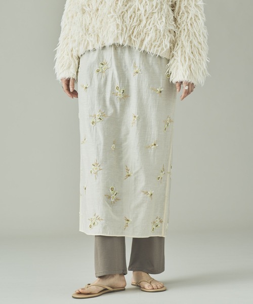 WEB先行予約受付中2026 SPRING&SUMMER COLLECTION 唯一無二のオリジナルの花柄ビーズ刺繍が印象的なスカート ■デザイン ・オーガンジー生地全体にオリジナルの花柄ビーズ刺繍を贅沢にあしらったデザイン。 ・ビーズの華やかな装飾が、コーディネートに圧倒的な存在感をプラス。 ・透け感のある素材を使用しているため、インナーやボトムを重ねたレイヤードスタイルがおすすめ。 ■素材 / お手入れ方法 ・シアーなコットンナイロンのオーガンジー素材。 ・刺繍を施した後、さらに仕上げとしてハンド刺繍で花のビーズをあしらった手の込んだ一着。 【Curensology(カレンソロジー)】 旅とは、非日常と日常の間を行ったり来たりしながら、その土地の空気や風景、文化、歴史、そして出会いを、五感のすべてを使って受け止めること。「カレンソロジー(Curensology)」は、そんな旅をイメージした、知的でエレガントな女性のためのワードローブとテキスタイルを提案。バカンスや出張に持っていきたい機能的なアイテムをはじめ、日々の暮らしをアップデートする新しいデザイン、着心地の良いエッセンシャルなものなどを展開しています。 ※サンプルにて撮影をしておりますので、実際の商品とは仕様や加工・サイズ等が若干異なる場合がございます。 ※屋外の光や照明の当たり具合で、実物と色味が異なって見える場合がございます。詳細画像の色味をご確認ください。 なお、商品の色や質感を出来るだけ忠実に再現するよう心掛けておりますが、パソコンなどの環境により、実物と若干異なる場合がございます。 ▼商品のお気に入り登録をおすすめします▼ ♡をクリック!完売カラーの再入荷や、ラスト1点の通知、セールの際の通知を受ける事ができます。ブランドのお気に入り登録もご一緒にお願い致します。