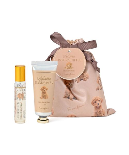 小さなバッグにも入れやすいハンドクリームと、ネイルオイルのギフトセットです。 パッケージの巾着は、光沢感のあるサテン生地に、キュートなプードルをプリントしたデザイン。 コンパクトなサイズ感なので携帯用ポーチとしても使用いただけます。 ◆フレッシュサボンの香り 【注意事項】 <全商品共通> ■食べ物ではありません。 ■お肌に異常が生じていないかよく注意して使用してください。化粧品がお肌に合わないとき即ち次のような場合には、使用を中止してください。そのまま化粧品類の使用を続けますと、症状を悪化させることがありますので、皮膚科専門医等にご相談されることをおすすめします。 (1)使用中、赤味、はれ、かゆみ、刺激、色抜け(白斑等)や黒ずみ等の異常があらわれた場合 (2)使用したお肌に、直射日光があたって上記のような異常があらわれた場合 ■傷やはれもの、しっしん等、異常のある部位にはお使いにならないでください。 ■色や香りに変化が生じることがありますが品質には問題ありません。 ■使用後は、必ずしっかり蓋をしめ、開封後はなるべく早めにお使いください。 ■ペットやお子さまの手の届かないところで、ご使用・保管してください。 ■直射日光の当たる場所、極端な高温・低温の場所を避けて保管してください。 <ポーチ> ■糸の引っ掛かりや引きつれが発生しやすいので、アクセサリーや周囲との摩擦にご注意ください。 ■洗濯はお避けください。 ■濃色部分は摩擦や汗・雨などにより色落ち色移りするおそれがありますのでお気をつけてください。 ■直射日光や照明の光に長時間あたりますと変色する場合がありますのでお気をつけください。 <ご使用方法> ハンドクリーム:適量を取り、爪や甘皮、手全体によくなじませてください。 ネイルオイル:爪の根もとに適量つけ、指で爪全体になじませてください。 ■原産国:中国