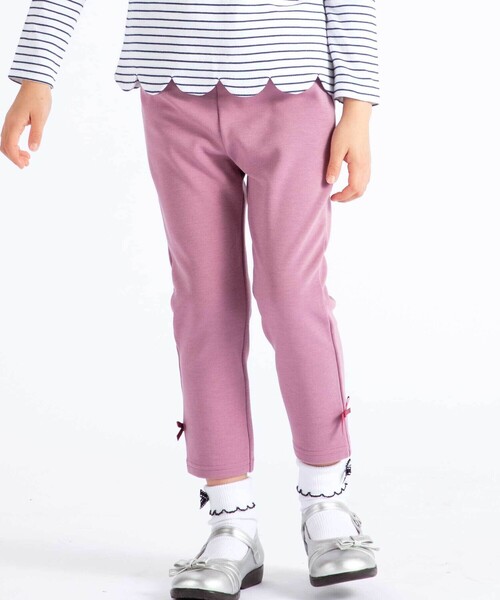 -26SS- すっきりとした細身のシルエットがアクティブに使いやすいロングパンツ。 ■デザイン ふくらはぎが隠れるくらいの8分丈でかわいい靴下などと合わせてコーデが楽しい♪ 裾にさりげなく付いた小さなリボンがワンポイント。 抗菌防臭加工の生地でたくさん汗をかく毎日の洗い替えにおススメです。 程よい肉感と柔らかな履き心地でオールシーズン着られます。 カラーはバリエーション揃えたくなるネイビー・ベージュ・ピンクの3色展開。 ■素材/機能 柔らかな生地感と程よい伸縮で着やすさのあるミラノリブの生地を使用。 体型を拾いすぎず型崩れしにくい品良く着られるニットソーです。 ※両脇・おしりポケットあり。 ※ウエスト裏にゴム調節口あり。 ※抗菌防臭は第三者機関認証済です。 26春夏 女の子アイテム 【BEBE CLOSET】 BeBeより新しい商品ラインナップ<ベベクローゼット>が登場。 通学通園に着せやすい服をお探しのパパママの気持ちに寄り添った普段使いのワードローブにおすすめしたいアイテムを考えました。 商品タグ表記は の記載となっております。 【2026年春夏 シーズンテーマ】 -今日は何しよう?- トラッドでベーシックなアイテムやスタイリングに、軽やかな素材づかいやクリーンな発色とクラフト感あるディティールづかいで楽しさをプラス。 「今日は何しよう?」のわくわくした気持ちをファッションを通して表現します。 【BeBe(べべ)】 ”LOVE MODERN” 少しおませで、生意気なヨーロピアンカジュアルの提案。 時代性・流行性をとらえ、ベーシックでもワンポイントを施した遊び心、楽しさを盛り込んでいます。 シンプルだけど、こだわりのあるオリジナリティーを重視しています。