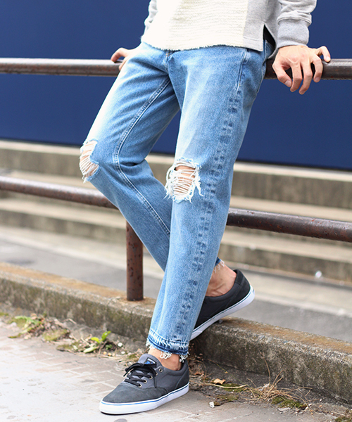 Lui's(ルイス) 「Big John」(ビッグ・ジョン)よりダメージカットオフデニムの入荷です。 ブランドでも定番的デザインのカットオフタイプに、今期はダメージを加え新たなモデルとして新登場いたしました。 シルエットはキャロット・レグというウエスト、腿周りにややゆとりを持たせ、ひざ下よりきつめのテーパードがかかったシルエットになっています。 トレンド性が強く、穿くだけで旬のスタイルを味わえる、お勧めのデニムパンツです! >BigJohn ビッグジョン 日本で初めて「デニム」を製作したとされる老舗デニムブランド。 古くからありながらも時代に合わせた提案で、現在も不動の人気である。