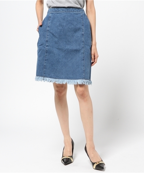 mystic(ミスティック) どんなトップスにも合わせやすいデニムスカートは、デイリーファッションのマストハブアイテム。サイドをパネルで切り替えた台形シルエットですっきりとした印象に仕上げながら、気になる体型を上手にカモフラージュ。旬のフォークロアテイストを感じさせる裾のフリンジ使いも見逃せません。