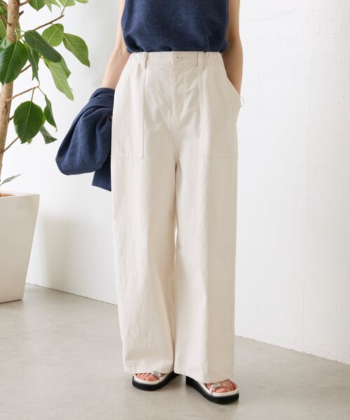 ■アイテム綿100%の素材にムライトピグメントダイ加工を施したワイドパンツ。ムラ糸(1本の糸の中で太い部分、細い部分がランダムに表れる糸に)顔料染めならではの奥行きある色合いと着込むほどに増す自然な風合いが魅力です。コットンならではの柔らかい肌触りと通気性の良さで快適な穿き心地を実現。ゆったりとしたワイドシルエットが脚のラインを拾わず、リラックス感がありながらも洗練された印象に仕上げています。シンプルなスタイリングに取り入れるだけでこなれた大人のカジュアルを演出する1本です。※画像はサンプルで撮影しています。ネイビーの実際のカラーは画像よりやや薄くなります。■素材・洗濯表示素材:綿100%洗濯表示:手洗い可、ドライクリーニング不可※着用時・洗濯時は、必ず取扱い表示・タグをご確認の上、お取り扱い下さい。----------------------------------伸縮性:なし光沢:なし厚み:ややあつい透け感:なし裏地:なしポケット:あり(両サイド)ファスナー:あり----------------------------------《お取り扱い上のご注意》・タンブル乾燥不可《予約商品について》・サンプルの為、素材情報、洗濯表示については企画段階の情報を記載しております。公的機関での試験データ結果を受け、量産にあたり混率や洗濯方法の変更が発生する場合がございますので、ご了承くださいませ。・サンプルでの撮影、計測をしております。商品の仕様が一部変更になる場合がございます。・撮影サンプル品はブランドタグがついておりません。製品にはタグがつきますので、製品の表に縫い糸が見える場合がございます。・工場の生産の都合上、納期が変更になる場合がございます。検品や輸送の関係で、発送日が前後しますのでご了承ください。また、入荷状況により、お客様への発送が店頭販売より遅れる場合もございます。・店頭に陳列していた商品も含まれる場合がございます。《商品画像について》ご覧頂いている商品の写真につきましては、できるだけ実物の色に近くなるように努めておりますが お使いの環境(モニター、ブラウザ等)の違いにより、色の見え方が実物と若干異なる場合がございます。 予めご了承ください。《ハートをタップして商品のお気に入り登録》【ハートをタップ】登録カラーの商品の「残りわずか」「再入荷」「値下げ」通知を受け取ることができます。【各ショップアプリにてブランドフォロー】 新商品などの入荷情報、最新のニュースやお得な情報を受け取ることができます。