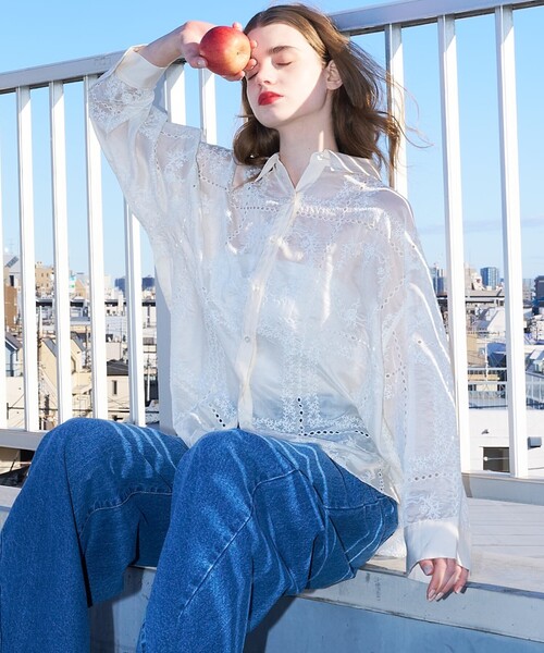 繊細な刺繍が映える、透け感レースブラウス【Design】透け感のある軽やかな素材×繊細な刺繍レースで仕立てたシャツブラウス。リラックス感のあるボックスシルエットとドレッシーな襟元で、カジュアルからきれいめまで幅広く活躍します。リッチな総レース仕様と、アイレット(穴あき)ディテールを施した、表情豊かなアイテム。前立てはボタン仕様で着こなしアレンジがしやすく、デニムでカジュアルダウンしたり、ベアトップ×スカートでフェミニンに仕上げたり、シーズンレスで活躍する一枚です。【Point】・ボックスシルエットで体型を選ばずリラクシーに着用可能・襟付き&前開きボタンでオン/オフ両方のコーデに対応・クレリック仕様の衿&袖カフスできちんと感も演出【Styling】羽織り感覚で重ね着しやすいサイズ感。透け感があるため、インナー(キャミソール・タンク)との合わせをおすすめします。すっきり見せたい場合はフロントだけタックインする着こなしも◎デイリー:デニムパンツ+スニーカーで大人のカジュアルダウンに。フェミニン:キャミソール+フレアスカートでリゾート〜お出かけスタイルに。オフィスカジュアル:ブライトカラーのタンクをインしてジャケットを羽織れば通勤やオフィスにも対応。レイヤード:ニットやベストのインにして透け感を活かした奥行きのある着こなしも◎**********************透け感:あり裏地:なし伸縮性:なし光沢感:なし生地の厚さ:薄手**********************