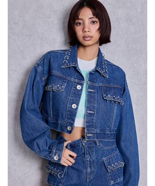 ■セットアップアイテムはこちら ring bijou studsデザインデニムショートパンツ ■デザイン トレンドのショート丈でスタイルアップを叶えるデニムジャケット。 シルバーのリングとビジュースタッズデザインがエッジィで、ストリートなムードをプラスしてくれる1着です。 ■スタイリング インナーをチラ見せして、抜け感あるコーデを楽しむのがおすすめ。 セットアップで着こなせば、一気に旬顔スタイルが完成。 ■商品のお気に入り登録 再入荷通知やラスト1点、お得なプライスダウンの情報も受け取ることができます。 ぜひご登録ください◎ ・・・・・・・・・・・・・・・・・・・・・・ ※着用画像はフラッシュの加減で実際の製品と色味等が異なる場合がございますので、生地のズームアップ画像をご確認ください。 ※ご利用の端末画面の設定により実際の商品と色味が異なる場合がございます。