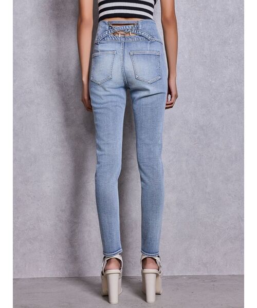 商品コメント: ハイウエスト+後ろに施したでカーブクロスデザインで、脚長美脚効果抜群のデニムスキニーパンツ。 カーブの曲線はウエスト引き締め効果もあり、取り外し可能なGYDAチェーンデザインで、後姿もかわいいデザインポイントの1本。 ストレッチ性に優れたデニム素材も履き心地抜群です◎ コーデ: ウエストデザインを見せてほしいので、レースビスチェなどの合わせがセクシーに見え、おススメです◎