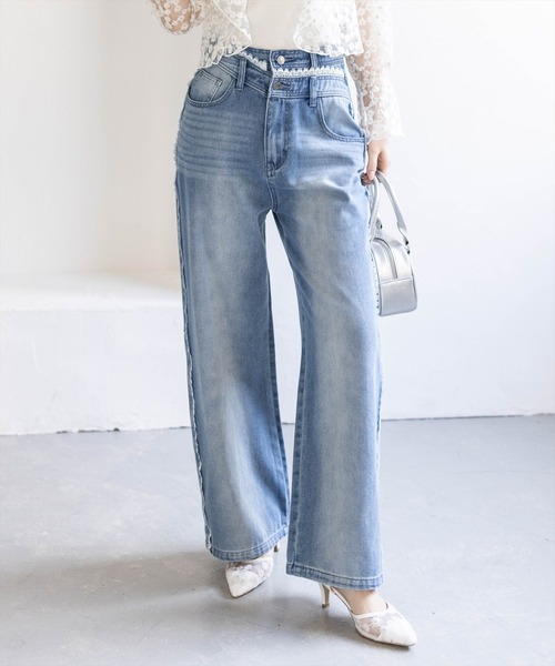甘さを仕込んだ主役デニム!サイドレースワイドデニムパンツ【デザイン】両サイドにあしらったレースが、カジュアルなデニムスタイルに女性らしさをプラス。甘くなりすぎず、いつものコーデに程よいアクセントを与えてくれます。トップスをインすればウエストデザインが映えます◎シンプルになりがちなデニムコーデを一気にアップデートしてくれる一本です♪【素材感】肌触りの良い綿素材伸縮性:なし/ 透け感:なし/ 裏地:なし 水洗いによる洗濯可 / ドライ・ウェットクリーニング可【コーディネート】シンプルなニットやカットソーと合わせることできれいめカジュアルなコーデに。ブラウスとも大人フェミニンな印象になり相性抜群◎インスタイルで脚長効果とスタイルアップが叶えられます!【※お取り扱い上のご注意】1:モニター環境等により実際の商品と多少色味が異なって表示される場合がございます。予めご了承下さい。2:屋外で撮影された商品は、天候により多少実際のカラーと異なる場合があります。商品のカラーはトルソー(マネキン)の商品画像をご参照ください。3:濃い色の商品は、お洗濯や摩擦等による移染にご注意ください。4:末永くご愛用頂く為に、アテンションタグ・洗濯ネームを必ずご確認の上、着用又はお取り扱い下さい。5:生産時期により、色、サイズ、デザイン、素材の質感が多少が異なる場合がございます。あらかじめ御了承下さいませ。