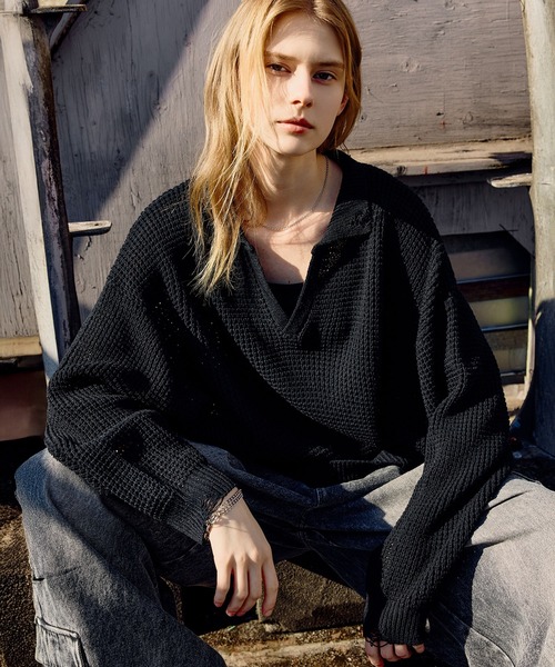 ■アイテム説明 ダメージ加工が存在感を放つスキッパーニット。 襟と裾、袖口にダメージ加工を施し、ヴィンテージ感溢れるアイテムに仕上げました。 程よく透け感があるため、コーデに取り入れるだけでこなれた印象に。 さらに襟付きのスキッパーデザインを採用することで上品さもプラスしてくれます。 身幅にゆとりを持たせ、肩の落ちたドロップショルダーデザインなど、トレンドを詰め込んだシルエットで旬の着こなしを楽しめる一着。 ユニセックスで着用可能なので、男女問わず旬のコーディネートをお楽しみいただけます。 ■素材 表情豊かなサーマル調の編地が特長の、柔らかいアクリル100%ニットを使用しました。 直接肌に触れてもチクチク感がなく、また軽い着心地で快適にご着用いただけます。 ■コーディネート ざっくりとした編地とダメージ部分の透け感がワンランク上のレイヤードスタイルに導きます。 インナーにシンプルなタンクトップを合わせるだけで、トレンドを押さえたコーディネートに。 リラックス感のあるオーバーサイズアイテムなので、パンツも少し大きめのアイテムを選ぶのがおすすめです。 ▼商品詳細 透け感:ややあり 裏地:なし 光沢:なし 伸縮性:あり ■ブランド説明 独自のコンセプトとデザイン性を トレンドに落とし込んだカジュアルウェアを提案 ※商品画像は、光の当たり具合やパソコンなどの閲覧環境により、実際の色味と異なって見える場合がございます。予めご了承ください。 ※目の粗い、ざっくりと編まれたニット地です。そのため、特に生地が引っ張られると編み目の間から肌が見えることがあります。透け感が気になる場合は、インナーの着用をおすすめしております。 【お買い物をお楽しみいただく為に】 ▼商品のお気に入り登録 完売カラーの再入荷通知や、ラスト1点の通知、セールの通知も受けることができます。 ▼ブランドのお気に入り登録 新商品や再入荷等、いち早くブランドのお得な情報を受け取ることができます。