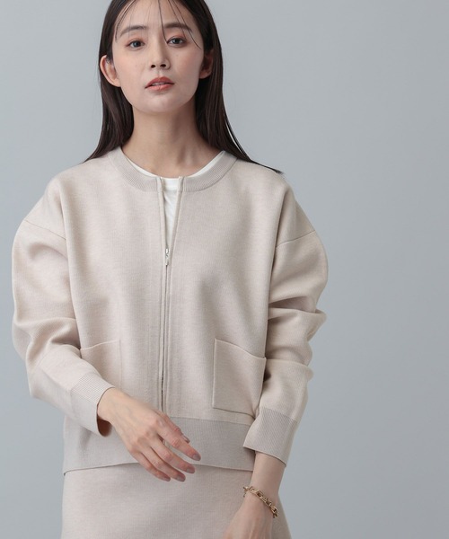 MATINEE LINE ・機能/素材 マシンウォッシャブル シルクをブレンドした柔らかな素材の裏側に、ポリエステルを組み合わせた ダブルフェイス素材を採用した、上品な質感のニットジャケット。 ・デザイン 着丈はトレンドの短めに設定しつつ、後ろ丈をラウンドさせて長くすることで、気になるお尻周りを自然にカバーできる仕様にこだわりました。 フロントのジップは、上下から開閉可能なダブルジップを採用。 裾側をスリットのように開けることで、ボトムスとのバランスを整えたり、着こなしに抜け感を出したりとアレンジが楽しめます。 フロントの大きなポケットがデザインのアクセントになり、一枚でサマになるアイテムです。 ・おすすめスタイリング 同素材のフレアスカート/640367と合わせたセットアップでの着こなしがおススメ。 ----------------------------- 透け感:透けない 伸縮性:あり 生地感・厚さ:普通 裏地:なし ----------------------------- ・グレイッシュベージュで計測しています。 (こちらは参考情報となります。カラーにより多少の誤差がございます。) ・こちらの商品はGLOBAL WORK独自の採寸方法となっています。本サイトのサイズガイドと採寸方法が異なる場合がありますのでご了承ください。 ・お買い物が便利になる機能がたくさん ・商品のお気に入り登録 完売アイテムの再入荷通知、ラスト1点、またクーポンやお値下げ通知をお知らせします。 ・ブランドのお気に入り登録 新商品や再入荷のお知らせ等、いち早くブランドのお得な情報を受け取ることができます。 ぜひご登録ください。