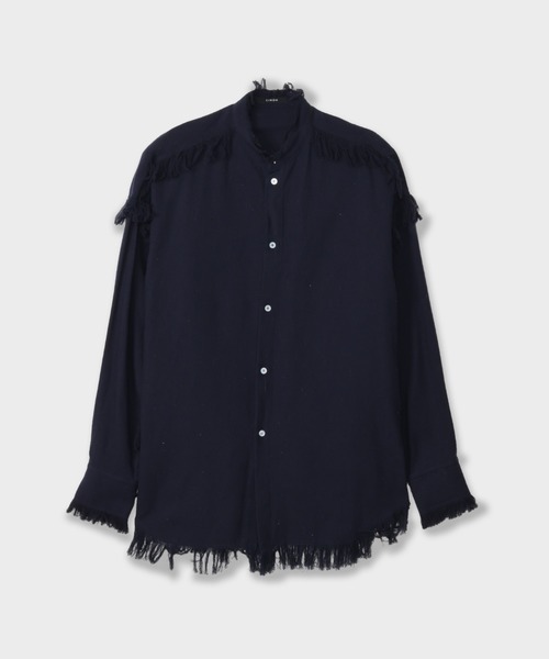 【フリンジシャツ】 ■FABRIC シルクノイルを使用した、カジュアル感のあるシャツ生地です。 ■DESIGN 縫い代を外側に出し、フリンジ仕様にした装飾シャツです。 縫い代が外側に出ることで接ぎのアタリがなく、着心地がより良くなっています。