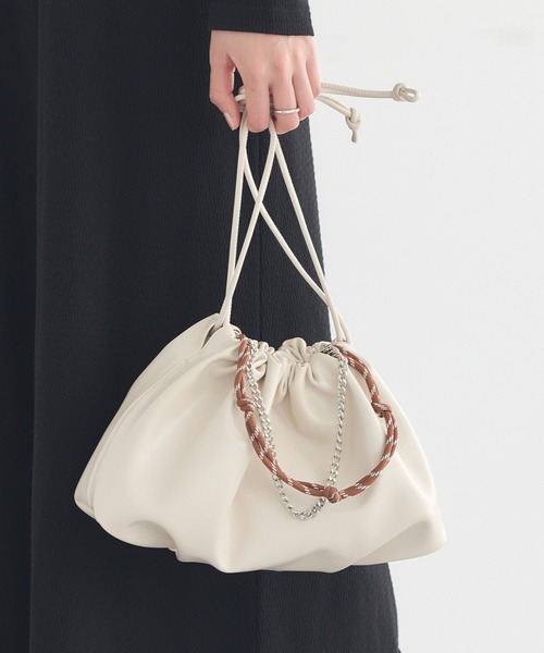 きゅっと結んで、可愛さも使いやすさも叶える◎やわらかな表情が魅力の巾着デザインです。丸みのあるフォルムがコーディネートにほどよい甘さを添え、大人可愛い印象に仕上げてくれます。コンパクトなサイズ感ながら、スマートフォンやミニ財布、ポーチなどの必需品はしっかり収納でき、見た目以上の実用性がうれしいポイントです。チェーンとコードを組み合わせた持ち手は、アクセサリー感覚で楽しめ、シンプルな装いのアクセントにもなります。持ち方を変えられるため、その日の気分やスタイリングに合わせたアレンジが可能です。デイリーのお出かけからちょっとしたお呼ばれまで幅広く活躍し、使うたびに気分を高めてくれる存在です。上品さと可愛らしさを両立したバッグを探している方におすすめです。※モデル着用画像は光の当たり具合で色味が違って見える場合がございます。商品の色味は物撮りの画像をご参照ください。● earth music&ecology ●(アースミュージック&エコロジー)「いいことある服。」たかが服。されど服。波風の多い日々のなかでもほほえんで前を向くあなたを、つつんで一緒に歩きたい。 いいことあるかも。そんな期待までまとえる服をあなたに。earth music&ecologyは、毎日を頑張る女性たちをちょっと前向きにするブランドです。 ▼ 商品のお気に入り登録がおすすめです ▼商品ページ内の「♡」ハートマークをクリック。完売時の再入荷や、最後の1点の通知、コーディネート画像がアップされたとき、お得なお値下げの際の通知を受ける事ができます。【お知らせ】ページでも通知が確認できます。