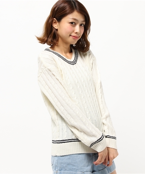 ●○秋も人気!スポーツカジュアル系ニット○●チルデンニットプルオーバーです。温かみがあるウール/アクリル素材を使用しています。フェミニンな印象のケーブル編みのニットです。ボトムスが合わせやすいサイズになっています。配色のラインがポイントです。デニムパンツやタイトスカートと合わせたスタイルがお勧めです。