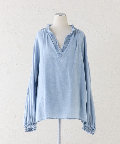 ピュアルセシン 2026 SS collection 【EFFORTLESS LUXE】 ◇細部のこだわりが光る、着るだけで自然とこなれて見えるシアーデニムブラウス◇ ●商品のお気に入り登録 クーポンやタイムセール、再入荷通知やラスト1点などお得な情報を受け取ることができます。 ご登録をお忘れなく◎ ●デザイン 軽やかなシアーデニム素材を使用したブラウスは 深めのVネックラインにあしらわれたカットオフのフリンジが程よいラフさを添え シンプルな中に自然な表情を生み出します。 身頃にはゆとりを持たせ、落ち感のあるシルエットが自然な抜け感を演出。 袖口はゴム仕様でギャザーを寄せ、 手首がすっきり見えるバランスに整えています。 薄手で通気性がよく、春夏は涼やかに、秋口にはインナーを重ねて季節の変わり目にも対応。 デニム特有のカジュアルさと上品さが調和し パンツにもスカートにも合わせやすい汎用性の高さが魅力です。 着るだけで雰囲気が整い、日常のスタイリングに自然とこなれ感を添えてくれます。 ●スタイリング 軽やかなデニム素材と深めのVネックが特徴のブラウスは 着こなし次第で大人の抜け感をつくれる万能アイテム。 白やキナリのワイドパンツを合わせて フリンジのラフさを引き立てるクリーンなスタイルに。 首元がすっきり見えるため、華奢なネックレスを添えると上品さが増します。 デニムパンツでワントーンにまとめると、 シアーブラウスの軽さが際立ちこなれた印象に。 ブラックやチャコールグレーのスラックスと合わせれば カジュアルな素材でも大人っぽくまとまり通勤にも馴染むバランスに。 袖口のギャザーが自然にボリュームをつくるため ナロースカート等のタイトめのボトムと合わせると全体がすっきり見えます。 季節に合わせてインナーを変えれば、ロングシーズン楽しめる万能なブラウスです。 ●素材 デニム特有の風合いを軽やかに仕上げた薄手の生地。 薄手ながらも、適度なハリ感がありシルエットをきれいに保ちます。 =============================== 洗濯方法:洗濯ネットを使用し洗濯機最弱コースで洗濯/非常に弱い操作のウエットクリーニング 透け感:あり 伸縮性:なし 光沢感:なし 生地の厚さ:薄手 【スタッフコメント】 年齢:40代前半/身長:155cm/普段着用サイズ:M~Lサイズ 着用感:軽やかな着心地。ドロップショルダーと広めの身幅でゆったりとしています。 ヒップに掛かる着丈なので、ボトムのデザインを選びません。 =============================== ※着用、お取り扱いの際は、商品についている品質表示とアテンションタグを必ずご確認下さい。 ※撮影場所やお使いのモニター環境により若干お色味が異なる場合がございます。特にロケの撮影では明るく見える傾向にございます。 ※予約商品はサンプルで撮影をしております。若干の仕様が変更になる場合がございますので予めご了承の上ご注文くださいますようお願いいたします。 【予約品の入荷時期について】 店舗入荷時期と予約商品のお届け時期が異なる場合がございますので、予めご了承ください