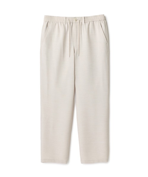 【こなれたカジュアル感に、清涼感と機能性を兼ね備えた万能なイージーパンツ】今季コレクションテーマ、広大な大地を旅するウェスタンのスピリットを背景に、日常に寄り添う快適さを形にした一本。ナチュラルな風合いが魅力の多機能素材 Reflax(リフラックス)のスラブオックス素材を使用し、天然素材のような表情と、現代的な機能性を併せ持っています。【デザイン/素材】多機能素材Reflax(リフラックス)のスラブオックスを採用。麻調のナチュラルな凹凸とムラ感のある表面が、乾いた荒野や大地を思わせる奥行きのある表情を生み出します。肌に触れると驚くほどさらりとした清涼感があり、ストレッチ性・吸汗性・通気性にも優れるため、汗ばむ季節でも快適な穿き心地をキープ。シワになりにくいイージーケア性も備え、旅先や日常使いに適した高機能素材です。カラーバリエーションは、広大な大地を想起させるナチュラルカラーを揃え、ウェスタンカルチャー特有の温もりと落ち着きを演出します。【シルエット】適度なゆとりを持たせながら、ワイド過ぎない絶妙なバランス。リラックスした穿き心地でありながら、だらしなく見えず、抜け感と余裕を感じさせます。【ディテール】ウエストは総ゴム仕様でストレスフリーな穿き心地。ドローコードは外に出してアクセントに、内側に収納してミニマルにもアレンジ可能です。吸水性が高くシワになりにくいため、休日の外出からきれいめなデイリースタイルまで幅広く活躍。旅する大人の日常に、自然体で溶け込む実用性と品の良さを備えた一本です。モデル:身長:185cm バスト:90cm ウエスト:77cm ヒップ:92cm 着用サイズ:03(L)※照明・光の加減、PCやスマートフォンなどの環境により、製品と画像のカラーの見え方が異なる場合がございます。※画像はサンプルのため、色味やサイズ等の仕様が変更になる場合がございます。※サイズは弊社規定の採寸によって記載しておりますが、若干の個体差が生じる場合がございます。