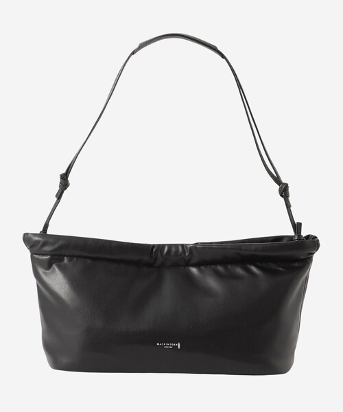 リサイクルナイロンの表面にPUコーティングを施した合成皮革で、非常に軽く柔らかい仕上がりとなっています。横長バランスの巾着バッグで物の出し入れもしやすく、適度な容量があり、内ポケットは両面に付いています。肩紐は結び目と結ばれた紐を上下にずらす事により長さの調節が可能です。肩当て、肩紐、巾着紐はしなやかなイタリアの牛革を使用しています。
