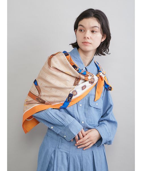 【華やかなモチーフとカラーが映える、上品なヴィンテージ調。さまざまな使い方で楽しめる、大判タイプのスカーフ】【Design/Styling】ベルトとチェーンをモチーフにした、エレガントな大判のスカーフです。上品なヴィンテージ調のデザインが、今年らしくて新鮮。全体に描かれた華やかな柄とカラーの組み合わせが、アクセントになってくれます。首や肩、頭、腰に巻くことで、スタイリングがブラッシュアップ。また、バッグに巻いたり結んだりするのもおすすめです。【Fabric】気軽に使えるポリエステル素材ですが、上品な光沢のあるつややかな質感は、まるでシルクのような高級感。リュクスなムードが楽しめます。カラーは2色をご用意。<GRN>、<ORG>で展開しています。※照明の関係により、実際よりも色味が違って見える場合があります。またパソコン・スマートフォンなどの環境により、若干製品と画像のカラーが異なる場合もございます。予めご了承ください。商品の色味は、商品単品画像をご参照下さい。 ※商品画像はサンプルのため、色味やサイズ等の仕様に変更がある場合がございますので、予めご了承ください。