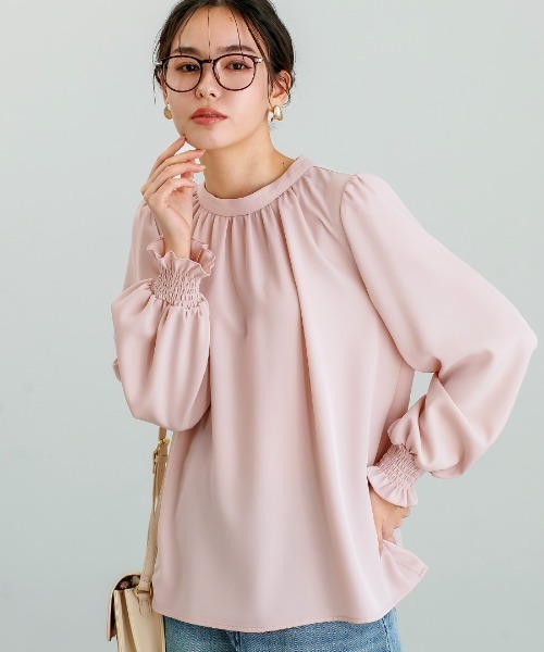 【 ディテール映え 】ソフトツイル・袖口シャーリングフレアブラウス■ White Collection ■「 ニュアンス袖で魅せる フレアブラウス 」シワになりにくく、ほのかな光沢感のあるソフトツイル素材で仕立てた、クチュールライクな一着。ふくらみのある素材感と、裾に向かってやさしく広がるフレアシルエットが身体のラインを拾いにくく、上品な印象に導きます。ギャザーを施したスタンドネックが顔まわりにやさしい華やかさを添え、クラシカルで女性らしい印象に仕上げました。肩にほんのり入ったギャザーと、シャーリングで立体感をもたせたボリューム袖が腕まわりをやさしく包み込み、動くたびに柔らかな表情を演出します。手首はシャーリングゴム仕様でたくし上げることで袖に表情の変化をプラス。袖口のフリルが、さりげないアクセントに。後ろネックはスリット開き&ループボタン留め仕様。光沢感のあるボタンが、後ろ姿にも上品さを添えます。アウトで着てもヒップラインをカバーする丈感でパンツにもスカートにも好相性。オフィスからきちんとしたシーンまで品よく着映える一枚です。【 color 】●オフホワイト[ほんのり黄味のあるオフホワイト]●ダスティピンク[くすみのある落ち着いたピンク]●グレイッシュブルー[くすみのある落ち着いたブルー]===================厚さ:★★☆☆☆ 透け感:オフホワイトはあり裏地:なし伸縮性:ナチュラルストレッチケア:洗濯機可シーズン:春・秋・冬===================【 fabric 】ポリエステル96% ポリウレタン4%【 model 】AMI JULIANNA 164cm S着用MADE IN CHINA(企画・検品は日本)ブラウス スタンドネック ボリューム袖 シャーリング袖 フリル袖 オフィス セレモニー デイリー きれいめ 上品 体型カバー