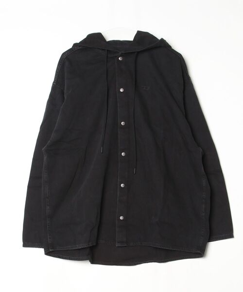 品番:A130330PBBAドローコードで調整可能なフーディーシャツ「D-DEWNY-HOOD」。スポーティなフードとロングラインの丸みを帯びた裾が特徴のハイブリッドシルエットを採用しています。デニム生地にクリーンなブラックウォッシュ加工を施し、胸元には大胆な赤いDロゴの刺繍がアクセントとして配されています。