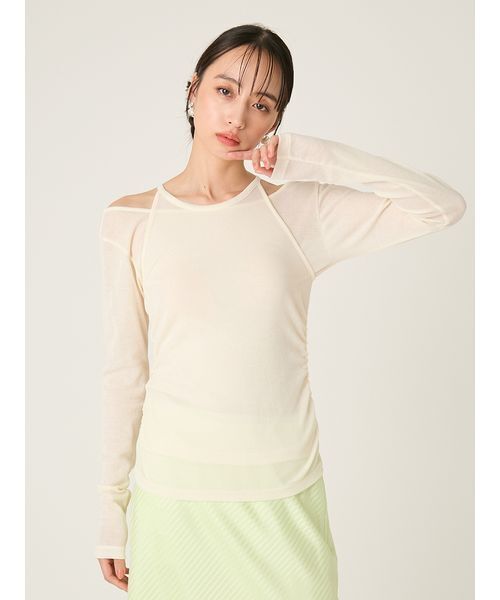 【ハンドウォッシャブル】【2WAYアンサンブルカットソーで旬のレイヤードスタイルを叶えて】【Design/Styling】レイヤード自在なアンサンブルカットソーは、アメスリタンクとロンTのセットアイテム。どちらも極細糸で繊細にお作りしたセミシアーの生地で、肌あたり抜群です。アメスリタンクは、脇部分にギャザーを寄せたディテールでニュアンスをプラス。ロンTは、背中が深めに開いたバックデザインで抜け感を演出。2枚をレイヤードすると、立体感が生まれて洒落たムードが漂います。どちらを上に重ねても素敵にキマるデザインで、デコルテ周りのモードな肌見せが高感度。さらにそれぞれ単品でも使えて着回し力抜群。スタイリングの可能性を高めてくれるセットです。手洗い可能でお手入れも簡単。色展開は全3色で、使いやすいIVR、スタイリッシュなLBLU、シーズンムードが高まるMINTがラインナップ。※照明の関係により、実際よりも色味が違って見える場合があります。またパソコン・スマートフォンなどの環境により、若干製品と画像のカラーが異なる場合もございます。予めご了承ください。商品の色味は、商品単品画像をご参照下さい。 ※商品画像はサンプルのため、色味やサイズ等の仕様に変更がある場合がございますので、予めご了承ください。