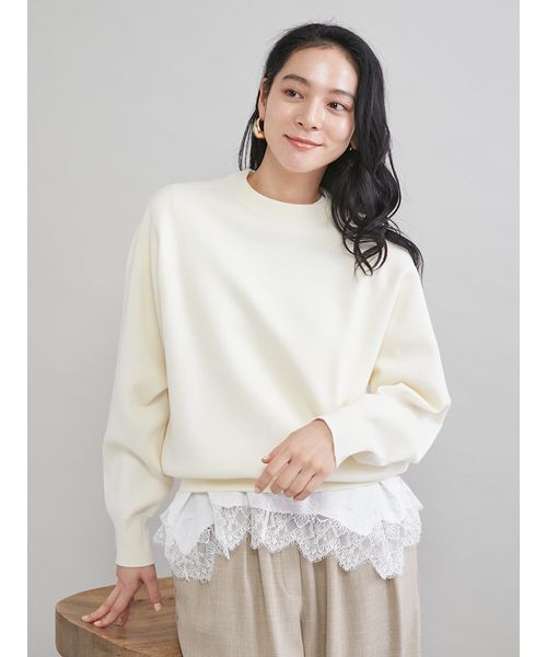 【ニットとTシャツの2枚がセットに。楽に完璧なバランスのレイヤードができて、それぞれ単品でも活躍!】 【Design/Styling】 ニットのプルーオーバーとレースヘムのTシャツの2枚がセットになったアイテム。絶妙なバランスのレイヤードスタイルが、失敗なく作れます。 ニットはドライタッチで、程よいハリ感がある編地を使用。一枚で着たときもサマになる、シンプルで応用範囲の広いアイテムです。 Tシャツは単品でも着用できる、ハリ感がありつつ、しなやかな天竺素材を使用しています。 2枚をレイヤードで着用すると、襟の部分のレイヤード見えと、裾のイレギュラーヘムのレースデザインが絶妙にのぞくのが華やか。動くたびに目を惹く、ロマンティックなムードを演出してくれます。 腰まわりも絶妙にカバーできるので、ボトムを選ばず着こなせるのもうれしいポイントです。 【Fabric】 ニットプルオーバーは、綿混の糸でしっかりと編み立てています。型崩れもしにくい、肉感とツヤ感のある素材です。 Tシャツ部分は、綿100%の天竺素材。しなやかさとハリがあり、一枚でもサマになる素材感です。 カラーは4色をご用意。<IVR>、<GRY>、<BRW>、<LBLU>で展開しています。 【本体】 透け感:なし 裏地:なし 伸縮性:ややあり 生地の厚さ:普通 ※照明の関係により、実際よりも色味が違って見える場合があります。 またパソコン・スマートフォンなどの環境により、若干製品と画像のカラーが異なる場合もございます。予めご了承ください。 商品の色味は、商品単品画像をご参照下さい。 ※商品画像はサンプルのため、色味やサイズ等の仕様に変更がある場合がございますので、予めご了承ください。