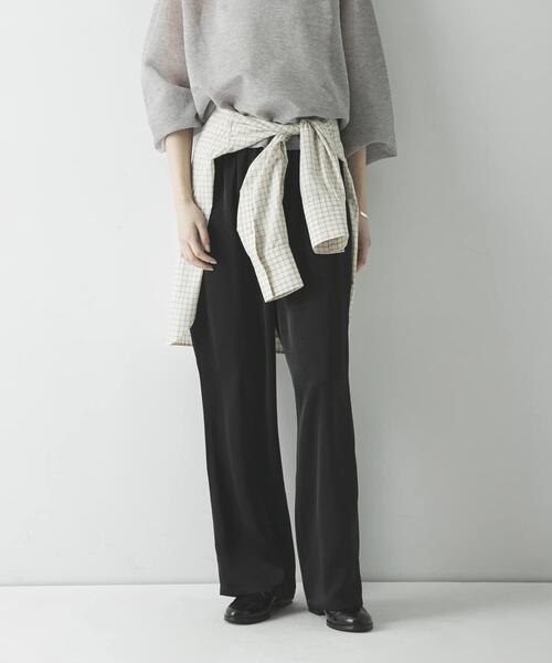 上品な光沢感と美脚シルエットを両立した、サテンイージーセミフレアパンツ。サテン特有の滑らかで上品なツヤ感が、スタイリングをクラスアップさせてくれる一本です。ウエストはストレスフリーなイージー仕様になっており、内側のドロストでフィット感の細かな調節が可能です。リラックスしたはき心地ながら、脚をすらっと美しく見せてくれるセミフレアシルエットが魅力。ニットやシャツを腰巻きにした軽やかなレイヤードや、スウェットを合わせたカジュアルなミックススタイルがおすすめ。カジュアルなアイテムからきれいめなトップスまで振れる万能さで、デイリーに幅広く活躍します。 POINT・脚をきれいに見せるセミフレアライン・上品なツヤ感のサテン素材・イージーウエスト、内側ドロストでサイズ調整可能【2026 Spring/Summer】【26SS】※この商品(BLACK)は、水分や汗、摩擦(特に湿った状態での摩擦)などにより色泣き、色移りする場合があります。また、白物・淡色物への色移りには充分ご注意ください。※ファスナー部分はフェイクです。予めご了承ください。※商品画像は、光の当たり具合やパソコンなどの閲覧環境により、実際の色味と異なって見える場合がございます。予めご了承ください。※商品の色味の目安は、商品単体の画像をご参照ください。▼お気に入り登録のおすすめ▼お気に入り登録された商品は、マイページにて現在の価格情報や在庫状況の確認が可能です。お買い物リストの管理にぜひご利用ください。素材感透け感 : ややあり(OFF WHITEのみ)伸縮性 : なし裏地 : あり(OFF WHITEのみ)光沢 : なしポケット : なしOFF WHITE:166cm(38) / 162cm(38)BLACK:166cm(38)3638