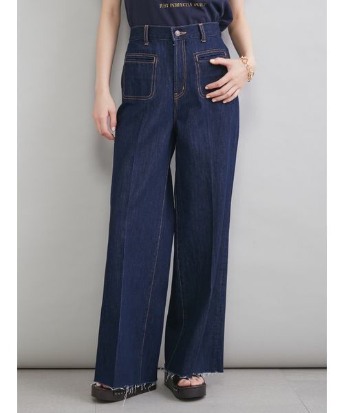 【デニムには珍しい、玉縁ポケットをアクセントに。脚長美脚が叶うセミフレアで、トレンドのボーホームード】【Design/Styling】デニムアイテムに定評のある『Mila Owen』。中でも人気の、パッチポケット付きデニムのシルエットをベースにした、新デザインが登場しました。ステッチワークが印象的な玉縁ポケットを前後に施し、ディテールにトレンドであるボーホームードをプラス。裾はカットオフになっていて、さらに横に渡る加工を加えることで、まるでリメイクしたかのような、ビンテージライクな印象に仕上げています。ウエストまわりはコンパクトで、裾に向かって広がる美脚シルエット。前後にセンタープレスが入っているので、より脚長効果も楽しめます。【Fabric】柔らかいライトオンスのデニム素材を使用しており、ステッチを効かせて味を出しています。加工にもこだわっていて、アタリや色落ち感を見事に再現。カラーは3色をご用意。カラーデニムの<BEG>、洗いをかけてリアルなアタリ感を出した<LBLU>、きれいめに穿ける<IND>で展開しています。【本体】透け感:なし裏地:なし伸縮性:なし生地の厚さ:普通※照明の関係により、実際よりも色味が違って見える場合があります。またパソコン・スマートフォンなどの環境により、若干製品と画像のカラーが異なる場合もございます。予めご了承ください。商品の色味は、商品単品画像をご参照下さい。 ※商品画像はサンプルのため、色味やサイズ等の仕様に変更がある場合がございますので、予めご了承ください。