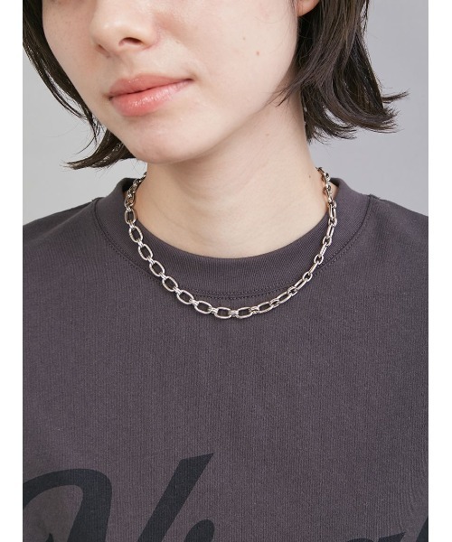 【今欲しい、ジャストなボリューム感と長さ。1点プラスするだけでスタイリングがアカぬける、チョーカータイプのネックレス】【Design/Styling】首元に馴染みやすいサイズ感の、シンプルなチェーンネックレス。今年らしいチョーカータイプで、ニットやTシャツとの相性も抜群です。大小のカンが連なった形で、適度なボリュームが存在感を発揮。程良いツヤ感のメタルカラーなので、コーディネートにプラスするだけで、大人のこなれ感のあるスタイリングが完成します。留め具の部分には、ブランドの“M”のロゴが入ったメタルパーツつき。手持ちのチェーンやモチーフネックレスと重ね付けするのもおすすめです。【Color】カラーは2色をご用意。華やかな<GLD>、シャープな<SLV>で展開しています。※照明の関係により、実際よりも色味が違って見える場合があります。またパソコン・スマートフォンなどの環境により、若干製品と画像のカラーが異なる場合もございます。予めご了承ください。商品の色味は、商品単品画像をご参照下さい。 ※商品画像はサンプルのため、色味やサイズ等の仕様に変更がある場合がございますので、予めご了承ください。