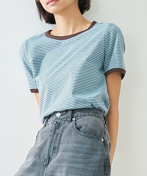 細ボーダー×配色リブで作る大人見えリンガーT【Design】肌なじみの良い細ボーダーに、ネック&袖口の配色が効いた1枚。ほどよく身体に沿う素材で抜群の着心地とすっきりしたシルエットを実現。デイリー使いはもちろん、ジャケットやシャツのインにも映える万能トップスです。【Fabric】細めピッチのボーダーと配色パイピングが顔回りをシャープに見せ、短めの袖丈が腕をすっきり見せます。程よいフィット感で1枚でもレイヤードでもバランスが取りやすく、カジュアルなデニム合わせからきれいめのタックパンツまで幅広く対応。伸縮性があるため動きやすく、毎日の着回しに重宝します。【Styling】カジュアル:ハイウエストデニム+スニーカーでシンプルに。きれいめ:テーパードパンツにインしてヒールやローファーをプラス。レイヤード:ジャケットやオープンシャツのインにして首元の配色をチラ見せも◎**********************透け感:なし裏地:なし伸縮性:あり光沢感:なし生地の厚さ:普通**********************