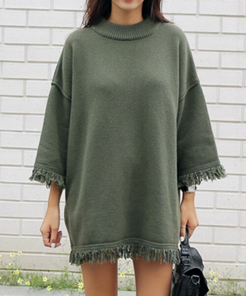 ゆるっとしたフォルムのニットワンピース♪ ドロップショルダーで全体的にゆったりしてますが、襟元がしっかりしたラウンドネックになっています。 袖、裾に施されているフリンジがまさにトレンド!!シンプルなので今シーズンに限らず長く着用していただけます☺ ※WEARに記載してある金額と、DHOLIC通販サイトに記載してある金額にシステム都合上、稀に誤差が生じます。正しい金額はDHOLIC通販サイトに記載された金額です。