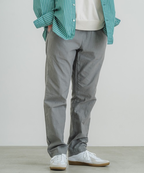 軽快な穿き心地が魅力のイージーパンツ。 麻混の薄手素材を使用しており、春先から夏場まで長いシーズン快適に着用いただけます。 ウエストはゴム+ドローストリングのイージー仕様で、ストレスフリーな穿き心地。 背面には貼りポケットを配してワーク感をプラスし、フロントはスラッシュポケットですっきりとした印象に仕上げています。 腿周りにほどよくゆとりを持たせ、裾に向かって自然に窄めた王道のテーパードシルエットで、スタイルを選ばず活躍する一本です。 【綿麻バックサテン】コットンのやわらかさとリネンの清涼感を併せ持った、綿麻バックサテン生地。 表面はマットで落ち着いた表情、裏面はサテン組織ならではのなめらかさがあり、程よいハリ感と肌離れの良さが特徴です。 バックサテンならではのコシがありつつも、綿麻素材のナチュラルな風合いで、使い込むほどに味わいが増していきます。