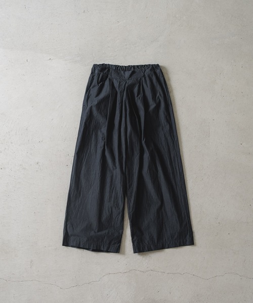 コットンブロードシャンブレーワッシャーを使用した、軽やかなイージーパンツ。 程よいハリとやわらかさを併せ持ち、ワッシャー加工による自然なシワ感が優しい表情です。 ウエストはゴム仕様でリラックスした穿き心地ながら、ストレートシルエットですっきりとした印象に。 デイリーからきれいめカジュアルまで幅広く活躍する一本です。 【コットンブロードシャンブレー】細番手のコットンブロードを使用した、シャンブレー調のワッシャー仕上げ生地。 程よいハリとやわらかさを併せ持ち、自然なシワ感がこなれた表情を演出します。