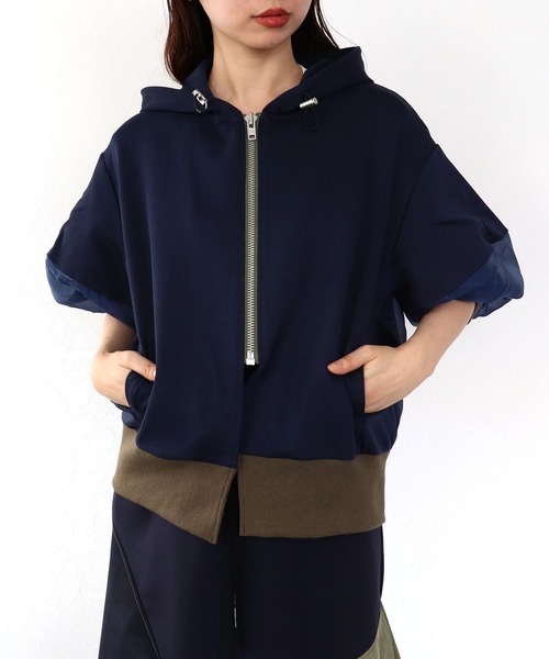 MARECHAL TERRE / コンビネーションフーディーオーガンジーのレイヤードの透け感がこなれたパーカー。 袖丈が短めなのでロングシーズン着用可能。 長袖のレヤードもお楽しみ頂けます。 ダブルジップが嬉しいポイント。 マルシャル・テルらしいエッジの効いたアイテムです。 -------------------------------------- 透け感:なし 裏地:なし 伸縮性:ややあり ケア方法:手洗い可 ※お洗濯の際は洗濯表示を必ずご確認ください。 -------------------------------------- <コーディネートmodel160cm> <詳細画像model162cm> [MARECHAL TERRE / マルシャルテル] 着る人を「凛」とさせる服作りをコンセプトに「Traditionalを遊ぶ」、トラッド・カジュアル・エレガント・モードを少しだけ捻ったデザインで30代のリアルクローズを提案。 着る人が心を動かされる物作り、シンプルで心地よく女性に共感を得ることを服作りのVISIONに。