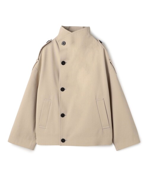 しなやかで膨らみのあるギャバジン素材のシリーズ。細番手のスーピマコットン糸とクリアな梳毛を多本撚りした糸を丁寧に織り合わせ、上品ではっきりと綾目の立った表面感に仕上げました。軽さがありながらもほど良い手持ち感があり、上質な風合いが魅力です。ショートコートはほのかに丸みのあるオーバル型にトレンチコートのディテールを取り入れた一着。首元はハイネックで着用するのはもちろん、今季はボタンを開けて襟を広げて抜け感を出した着こなしもおすすめです。さらりと羽織るだけでさまになり、春先のカジュアルスタイルにぴったりのアイテム。■素材情報厚み:普通 透け感:なし光沢:なし伸縮性:なし手洗い:不可裏地:あり(総裏)※商品の色味は、商品単体または素材アップ画像をご確認ください2026SS商品店舗にお問い合わせの際は、下記の商品番号をお申し付けください。商品番号:23-08-61-08002