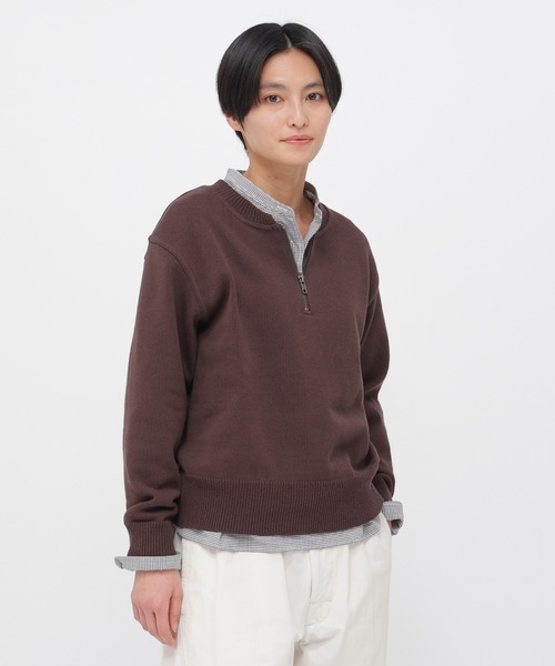 山形の老舗ニットメーカー、米富繊維との新たな取り組みによる特別なニット。表にコットン、裏にリサイクルポリエステル糸をプレーティングして編み立て、限りなく度詰めに仕上げることで、ドライでクリアな目面と軽さをあわせ持つ素材感。ミドルゲージながら、しっかりとした肉感とスポーティな表情を備えた仕上がり。編地の特性をいかし、スウェットライクなハーフジップデザインに落とし込んだ一枚。ラウンドしたリブ襟のカッティングや、カバーステッチによるディテールがポイント。 ※こちらはMHL.SHOP・mix.tokyo限定の商品です。 ※こちらはウィメンズの商品です。▽お気に入り登録<商品のお気に入り登録>完売カラーの再入荷通知や、ラスト1点の通知、セールの通知も受け取ることができます。<ブランドのお気に入り登録>新商品や再入荷など、いち早くブランドの情報を受け取ることができます。