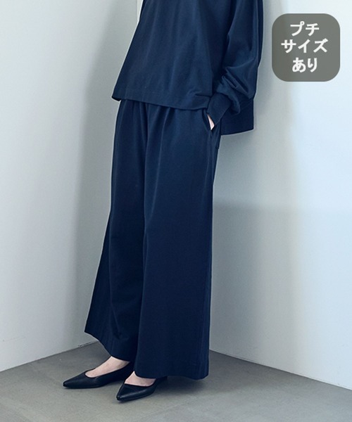 体型カバーも叶うゆったりシルエット履き心地の良いワイドパンツーーー【素材】カジュアル過ぎない綺麗見えのミニ裏毛素材を使用。ダブルバイオ加工を施しています。【デザイン】ゆったりシルエットが特徴的なミニ裏毛素材のワイドパンツ。カジュアル過ぎず、部屋着感もなくしたシルエットに仕上げました。落ち着いたカラー展開なので、コーデに取り入れやすいのもポイントです。ーーー【スタイリング】女性らしいブラウスやカジュアルにカットソー合わせがおすすめ。同素材の『品番:643818 ミニ裏毛Wバイオゆるプルオーバー』とセットアップで着用するのも素敵です。