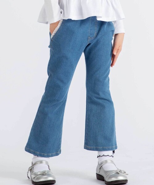 -26SS- 程よい厚みと動きやすいストレッチが人気のジョグデニムを使用したロングパンツ。 ■デザイン 膝まではフィット感がありすっきり、ひざ下から広がるフレアのシルエットがトレンド感がありかっこいい。 メリハリがありレッグラインをきれいに見せてくれるボトムです。 こなれ感のあるブリーチのブルーと、春らしいカラーデニムのピンクの2色展開。 ポケットにはレースをあしらってナチュラル可愛い雰囲気に。 小さなリボンも付いています。 ■素材/機能 オールシーズン使える柔らかく程よい厚みのジョグデニムの生地を使用。 お子様の動きに合わせて良く伸び、通学などにも使いやすい。 シーズンごとのリピーターの方も多い素材です。 ※両脇ポケットあり。 ※ウエスト裏にゴム調節口あり。 ※生地の特性上、色落ちや色移りする可能性があります。淡色製品とあわせての洗濯・着用に十分ご注意ください。 ※製品の生産過程によりレースには本体のカラーが移染しております。こちらはデザイン上のものなのでご理解いただきますようお願いいたします。 26春夏 女の子アイテム 【2月 GIRL】 - シテ島の花市場へ - 春の光を浴びてキラキラ光るセーヌ川を渡ってシテ島にある花市場へ。 色とりどりの花が並ぶ市場は、朝のお散歩にぴったり。 新鮮な植物の香りを楽しみながら、お気に入りのブーケを選ぼう。 ナチュラルさのある素材感と、明るいカラーリングでお花選びのひとときにぴったりのスタイリングを提案。 【2026年春夏 シーズンテーマ】 -今日は何しよう?- トラッドでベーシックなアイテムやスタイリングに、軽やかな素材づかいやクリーンな発色とクラフト感あるディティールづかいで楽しさをプラス。 「今日は何しよう?」のわくわくした気持ちをファッションを通して表現します。 【BeBe(べべ)】 ”LOVE MODERN” 少しおませで、生意気なヨーロピアンカジュアルの提案。 時代性・流行性をとらえ、ベーシックでもワンポイントを施した遊び心、楽しさを盛り込んでいます。 シンプルだけど、こだわりのあるオリジナリティーを重視しています。