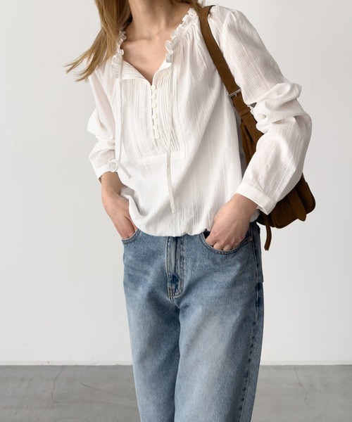 デザインピンタックデザインと首元のフリルがポイントのブラウス。裾はゴムになっているので、丸みのあるシルエットが女性らしい印象に。素材やや薄手のコットン素材で、これからの季節におすすめの1枚。コーディネート短すぎず長すぎない程よい着丈でどんなボトムにも合わせやすく、デイリーユースに◎デニムと合わせたカジュアルスタイルから、スカートと合わせたフェミニンまで幅広くお使いいただけます。-------------------------------------生地の厚さ:厚い〇〇〇●〇薄い伸縮性:なし透け感:ややあり裏地:なし光沢:なし-------------------------------------取扱い・蛍光増白剤が入っていない洗剤をご使用ください。・クリーニングネットをご使用ください。・濃い色と白 ・淡色物は分けて洗ってください。・洗濯で多少縮むことがあります。洗濯後はすばやく形を整えて干してください。タンブラー乾燥はお避けください。・アイロンの際は当て布をご使用ください。・着用時の汗や摩擦により、他の衣類や鞄などに色移りすることがありますので、淡色系との着合わせはご注意ください。・摩擦や引っかけにご留意ください。※取り扱い及びお手入れ方法については、商品についている取扱表示、洗濯表示にてご確認下さい。※照明の関係により、実際よりも色味が違って見える場合があります。またパソコン・スマートフォンなどの環境により、若干製品と画像のカラーが異なる場合もございます。※商品の色味は、商品アップ画像をご参照ください。