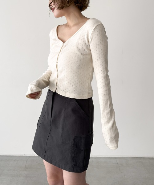 デザイン レースのようなアイレット生地が女性らしい印象に。 首元は広めのVネックなのでデコルテラインを綺麗に見せてくれます。 素材 身体に沿うシルエットながら柔らかく、伸縮性があるのでストレスなく着ていただけます。 コーディネート カジュアルからフェミニンまで幅広いコーデに活躍。 シンプルなデザインでオンオフ問わず合わせやすいアイテムです。 ------------------------------------- 生地の厚さ:厚い〇〇〇●〇薄い 伸縮性:あり 透け感:BLK,REDなし/IVOややあり 裏地:なし 光沢:なし ------------------------------------- 取扱い ・蛍光増白剤が入っていない洗剤をご使用ください。 ・クリーニングネットをご使用ください。 ・濃い色と白 ・淡色物は分けて洗ってください。 ・洗濯で多少縮むことがあります。洗濯後はすばやく形を整えて干してください。タンブラー乾燥はお避けください。 ・アイロンの際は当て布をご使用ください。 ・着用時の汗や摩擦により、他の衣類や鞄などに色移りすることがありますので、淡色系との着合わせはご注意ください。 ・摩擦や引っかけにご留意ください。 ※取り扱い及びお手入れ方法については、商品についている取扱表示、洗濯表示にてご確認下さい。 ※照明の関係により、実際よりも色味が違って見える場合があります。またパソコン・スマートフォンなどの環境により、若干製品と画像のカラーが異なる場合もございます。 ※商品の色味は、商品アップ画像をご参照ください。