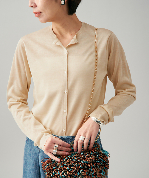【2026SS】 VERMEIL par iena シルクを贅沢に混紡した素材ならではの、しっとりと肌に寄り添う心地よさと、自然な艶が美しく映えるクルーネックカーディガン。 身体にほどよく沿うすっきりとしたシルエットが、トップスとしても軽い羽織りとしても使いやすく、日常に上質なニュアンスを添えてくれます。 小ぶりのボタンによる控えめなディテールがさらに洗練度を高め、合わせるボトムを選ばない汎用性も魅力です。 ドラマティックに揺れるフレアスカートから、きれいめなスティックパンツ、カジュアルなデニム、そして今年らしい軽快さの出るハーフパンツまで、どんなスタイルとも自然に溶け合います。 シーズンを問わず着られる軽さと上質感を備え、ワードローブに一枚あるだけでスタイリングの幅を広げてくれる、頼れる定番カーディガンです。 ********************** 透け感:あり 裏地:なし 伸縮性:ややあり 光沢感:ややあり 生地の厚さ:普通 ********************** 【お取り扱い等について】 ・取り扱いについては、商品についている品質表示でご確認ください。 ・照明の関係により、実際よりも色味が違って見える場合があります。 またパソコン・スマートフォンなどの環境により、若干製品と画像のカラーが異なる場合もございます。 ・商品の色味は、商品アップ画像をご参照ください。 ・こちらの商品は、VERMEIL par iena での取り扱いになります。 直接店舗へお問い合わせの際は VERMEIL par iena店舗へお願い致します。 ベージュ着用スタッフ身長:163cm 着用サイズ:フリー カーキ着用スタッフ身長:162cm 着用サイズ:フリー 詳細着用スタッフ身長:163cm 着用サイズ:フリー 本体:手洗い可能