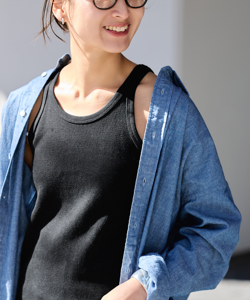 表情のあるサーマル生地を使用した、ベーシックで合わせやすいタンクトップ。 すっきりとしたアメリカンスリーブのデザインが、肩まわりを美しく見せてくれます。 一枚ではもちろん、シャツやジャケットとのレイヤードスタイルにもおすすめ。 地厚でしっかりとした素材感があり、安心感のある着心地を長く楽しめる一枚です。 ********************** 透け感:ホワイトのみあり 裏地:なし 伸縮性:あり 光沢感:なし 生地の厚さ:普通 ********************** ※取り扱いについては、商品についている品質表示でご確認ください。 ※こちらの商品は、FRAMeWORK での取り扱いになります。 直接店舗へお問い合わせの際は FRAMeWORK 店舗へお願い致します。 ※照明の関係により、実際よりも色味が違って見える場合があります。 またパソコン・スマートフォンなどの環境により、若干製品と画像のカラーが異なる場合もございます。 予めご了承の上ご注文ください。 ※商品の色味は、商品アップ画像をご参照ください。 本体:手洗い可能