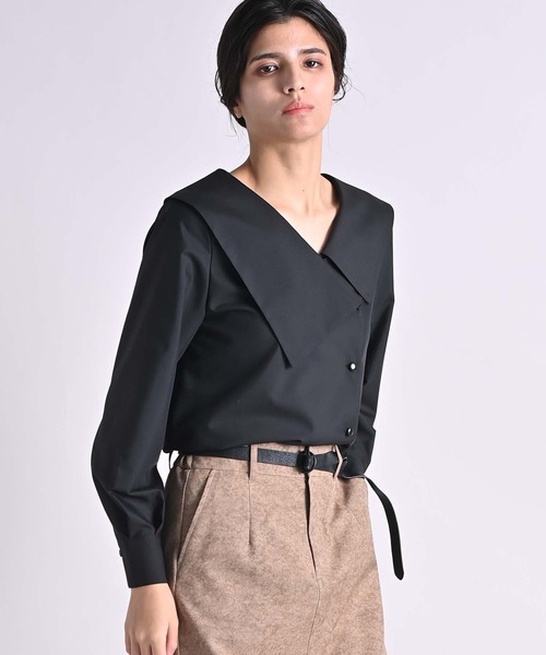 アシンメトリーな襟が目を惹くモード×クラシカルな一着【デザイン&ディテールポイント】アシンメトリーに配したビッグカラーが視線を引き寄せる、存在感のあるブラウス。シャープさと柔らかさを併せ持つデザインで、甘さに寄らずモードな印象に仕上げている。ほどよくハリのある素材が立体的なフォルムを保ち、シンプルな身頃とのコントラストが際立つ一枚。フロントはすっきりとした印象ながら、角度によって表情が変わるのも魅力。一枚でスタイルが決まり、レイヤードせずとも完成度の高い着こなしが叶うブラウス。※生地カラーは物撮りにてご確認ください。【スタイリングポイント】ワイドパンツやストレートパンツと合わせて、直線的でクリーンなモードスタイルに。アウターはノーカラージャケットやミニマルなコートを重ね、衿デザインを主役に。■使用上の注意濃色の物は汗や雨でぬれた時、又は強い摩擦により色移りすることがあります。濡れた状態での放置、重ね置きをしないでください。軽く押し洗いをして下さい。あて布使用。===========================厚み:薄い伸縮性:ややあり裏地:なし透け感:ややあり生地感:ソフト洗濯:手洗い可===========================【Anside/アンサイド】遊び心のあるデザインディティール, 色彩豊かなバリエーションで心躍る毎日を・・・。自分のスタイルや着こなしを大切にしたい女性におくる大人モードカジュアル。環境に配慮しつつ、長く大切に着て貰える“タフだけど、ラフ過ぎない”リアルクローズを提案します。
