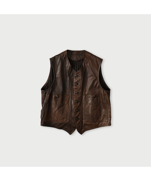 たからもののレザー一生に一度は袖を通してみたい文句なしに格好いいメイドインジャパンのホースレザーです。植物性のタンニンでなめしたあと、1枚革の状態で草木染の染料を使って時間をかけてカチン染めをしました。しっかり乾燥させてから丁寧にオイルをたっぷりと入れて、風合いを出しています。余計なものはそぎ落としたシンプルなベスト。着こんでいくうちにさらにツヤが出てきます。1枚革で仕立てたイメージで出来る限りステッチを目立たせない縫製にしています。