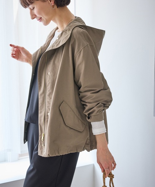 撥水機能を搭載したマウンテンパーカー。【素材感】 ・カジュアルすぎない、きれいめな表面感のグログラン素材。 ・ON、OFF問わず取り入れやすい素材感。 ・撥水加工機能を備えた、雨の日に嬉しい機能素材。 【デザイン・シルエット】 ・ワイドシルエットに短めの着丈を組み合わせた、バランスの取りやすいデザイン。 ・ゆとりのある袖で、ニットやカットソーも中に着込みやすいシルエット。 ・高めの衿からつながるフードデザインで、顔まわりをすっきりと見せる効果も期待できる。 ・メタル付属使いで、きれいめな印象に仕上げたブルゾン。 【カラー】 ・チャコール、キナリ、ブラウン、ネイビーの全4色展開。 ・カラーによってファスナーの色が異なります。 ※チャコール(06):シルバー ※キナリ(16):シルバー ※ダークブラウン(20):ゴールド ※ネイビー(40):シルバー 【スタイリングポイント】 ・ワンピースやロングスカートと合わせた、カジュアルミックスなスタイリングがおすすめ。 ・裏毛フーディをインナーに重ねた、ほどよくラフなレイヤードスタイルにも。 【前シーズンのベーシックマウンテンパーカー(品番:GDL15140)をアップデート】 ・肩幅・身幅を中心に全体の寸法をゆったり調整し、レイヤードしやすいサイズ感に。 ※以前好評だった(品番:GDL15140)と同型です。 組成を一部変更しております。 旧品番 綿 67% ナイロン 33% 新品番 綿 64% ナイロン 36% ----------------------------- 裏地:なし 光沢感:あり 透け感:なし 伸縮性:なし ファスナー:あり ポケット:あり ボタン:あり(開閉可) 生地の厚さ:普通 その他仕様:裾ドロスト仕様 季節:春、秋 ----------------------------- ※撮影時の光、お使いのモニター環境によって色の見え方が違う場合がございます。 ※2025年秋冬商品より、ワンサイズ展開の商品は「F(フリーサイズ)」表記に変更しております。 詳しい採寸はサイズ欄をご覧ください。 【モデル着用サイズ】 ショートヘアーモデル身長:168cm 着用サイズ:F ロングヘアーモデル身長:165cm 着用サイズ:F 【2026 Spring】【26SS】