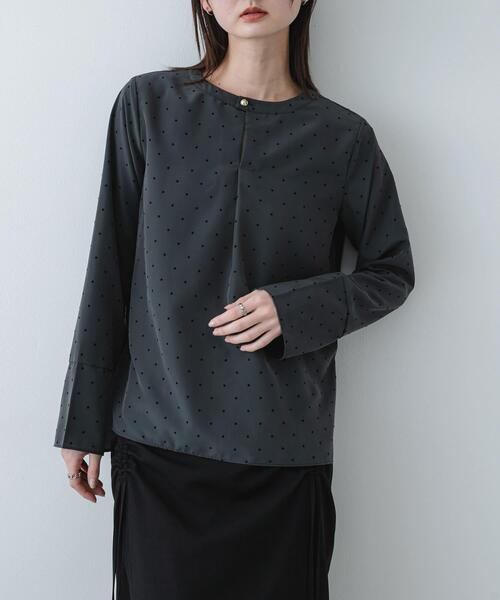 【凛とした美しさを纏う。オケージョンにも映えるドット柄ブラウス】 ・さらっとした肌触りが心地よいポリエステル素材を使用し、一日中快適な着心地をキープ ・控えめなドット柄が、オケージョンやセレモニーなどの大切なシーンにも華を添える一着 ・お出かけからフォーマルまで。オンオフ問わず自分らしく装えるシーンレスな万能アイテム 繊細なドット柄が、クリアでシンプルな佇まいを演出するスタンドカラーブラウス。シワになりにくいポリエステル生地を採用し、等身大の日常から特別な一日まで、スマートに寄り添います。首元のスタンドカラーとスリット入りの裾デザインが、抜け感のある洗練されたシルエットを実現。セレモニーシーンで品よく決まるのはもちろん、デニムと合わせて軽やかなお出かけスタイルを楽しむのも素敵です。 【2026 Spring/Summer】【26SS】 ※この商品は素材及び編地の性質上、着用中、着脱時、及びアクセサリー等で引きつれ、引っ掛かり易い為、取扱いにはご注意ください。 ※その他お取り扱いに関しましては、商品に付属のアテンションタグをご覧ください。 ※商品画像は、光の当たり具合やパソコンなどの閲覧環境により、実際の色味と異なって見える場合がございます。予めご了承ください。 ※商品の色味の目安は、商品単体の画像をご参照ください。 ▼お気に入り登録のおすすめ▼ お気に入り登録された商品は、マイページにて現在の価格情報や在庫状況の確認が可能です。 お買い物リストの管理にぜひご利用ください。 素材感 透け感 : ややあり(IVO×BLK, Y.BEIGE) 伸縮性 : なし 裏地 : なし 光沢 : ややあり(CHA×BLK) ポケット : なし One