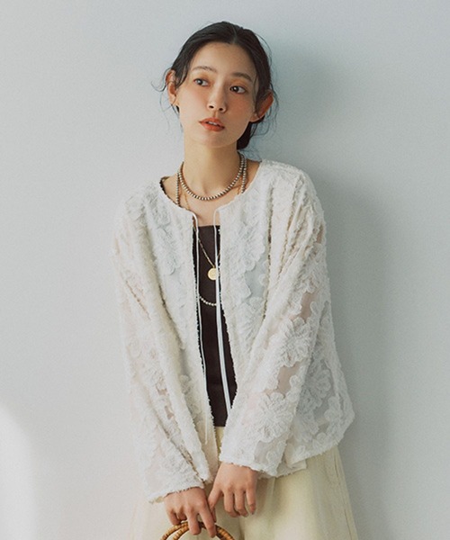 春らしいフラワーモチーフが魅力前後2WAYで着用可能なブラウスーーー【素材】ふわふわと毛足のあるカットジャガード素材を使用。透け感のある素材で軽い仕上がりです。身頃には裏地を付けているので安心してご着用いただけます。【デザイン】フラワーモチーフが春らしく、優しい印象のブラウス。嬉しい前後2WAY仕様なので着こなしの幅が広がります。一枚で存在感があるブラウスは、春のスタイリングの主役にぴったりです。トップス レース ブラウス シャツ 2WAYーーー【スタイリング】リボンをあえて結ばずに垂らした今季トレンドの着こなしがおすすめ。カジュアルにデニム合わせや、ボリュームのあるパンツにフロントインした雰囲気のある着こなしも素敵です。前開きの時はカーディガンにもなるので様々な着こなしをお楽しみください。